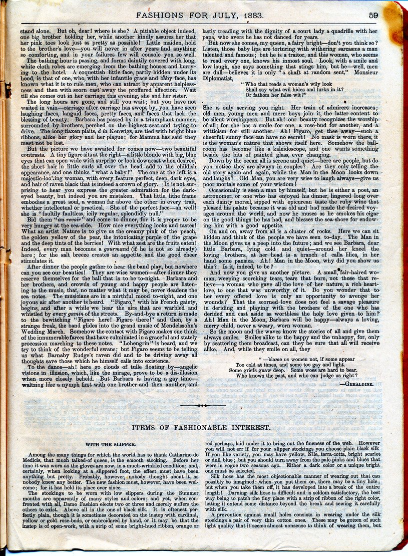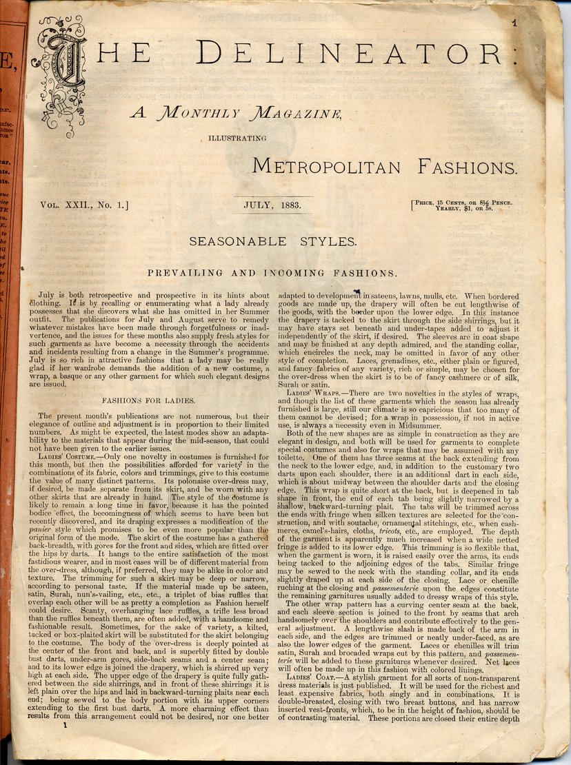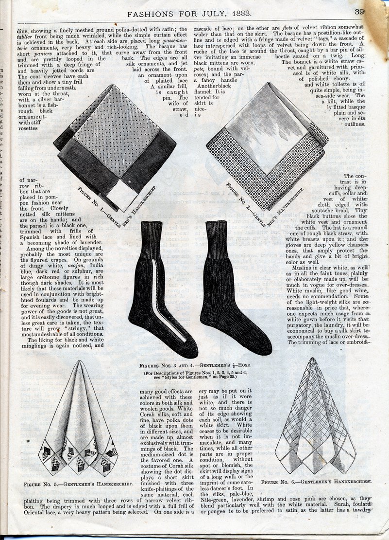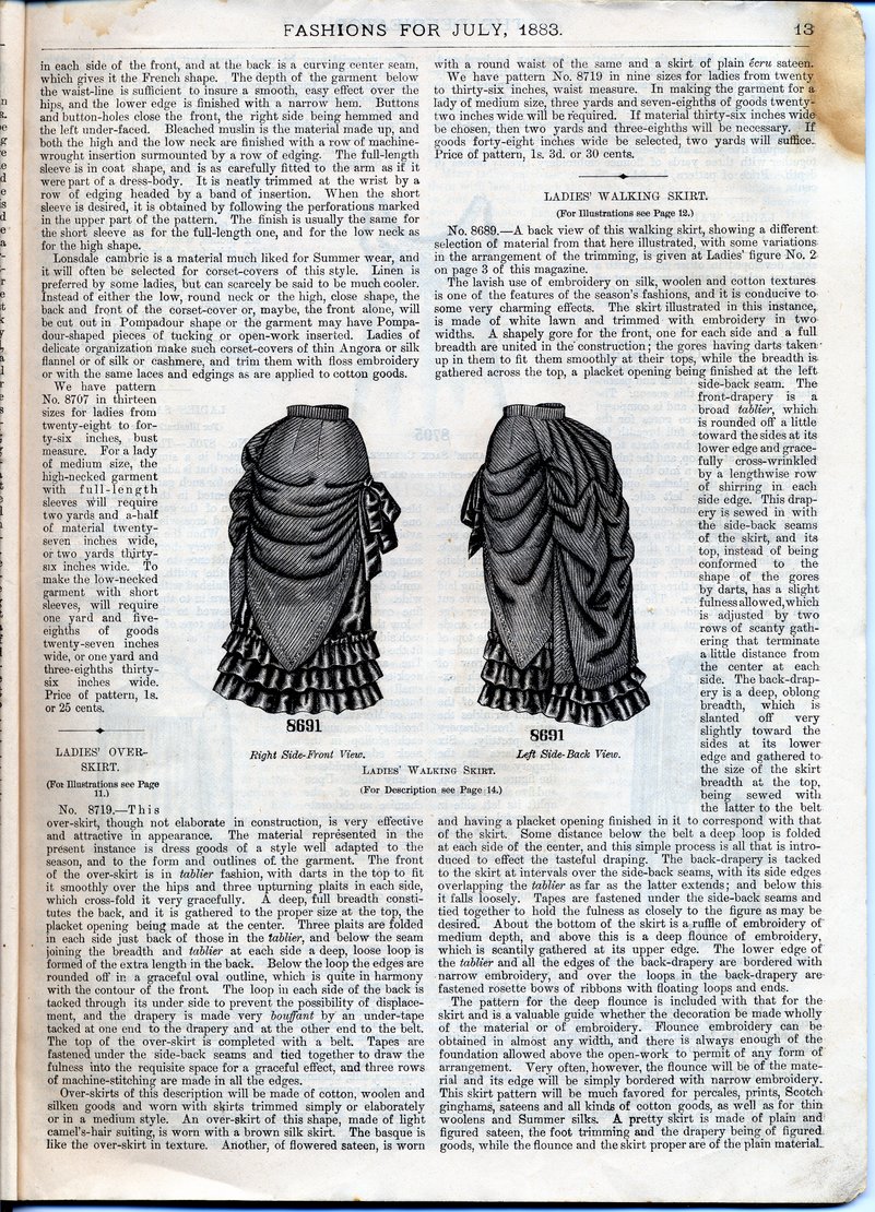 Because this magazine is from the middle of 1883, it falls right between the end of the natural form period and the beginning of the late bustle era. I thought it was rather amusing that there are both natural form and mildly bustled outfits sprinkled throughout it. I guess the switch over was more gradual than most people present it as.