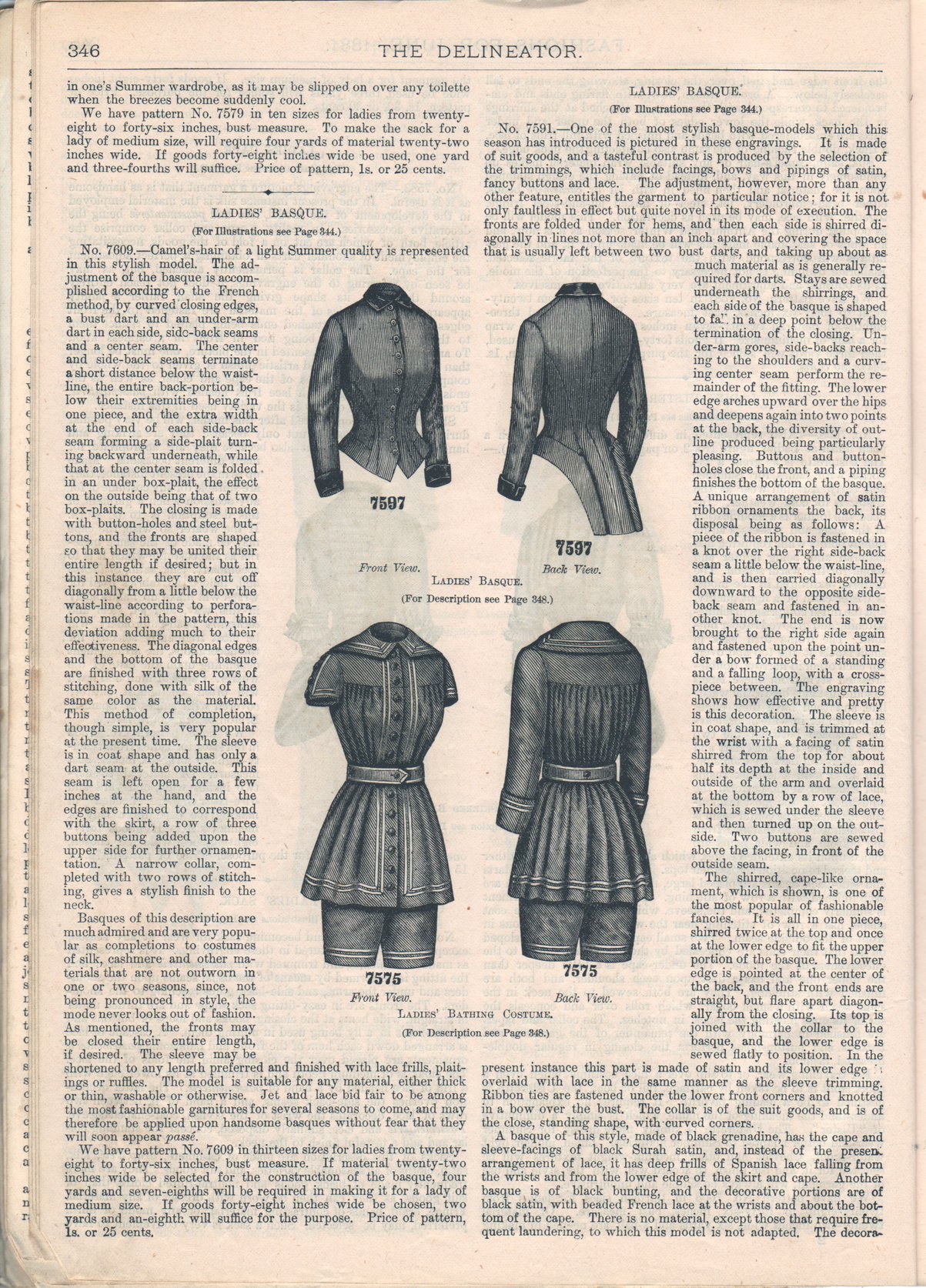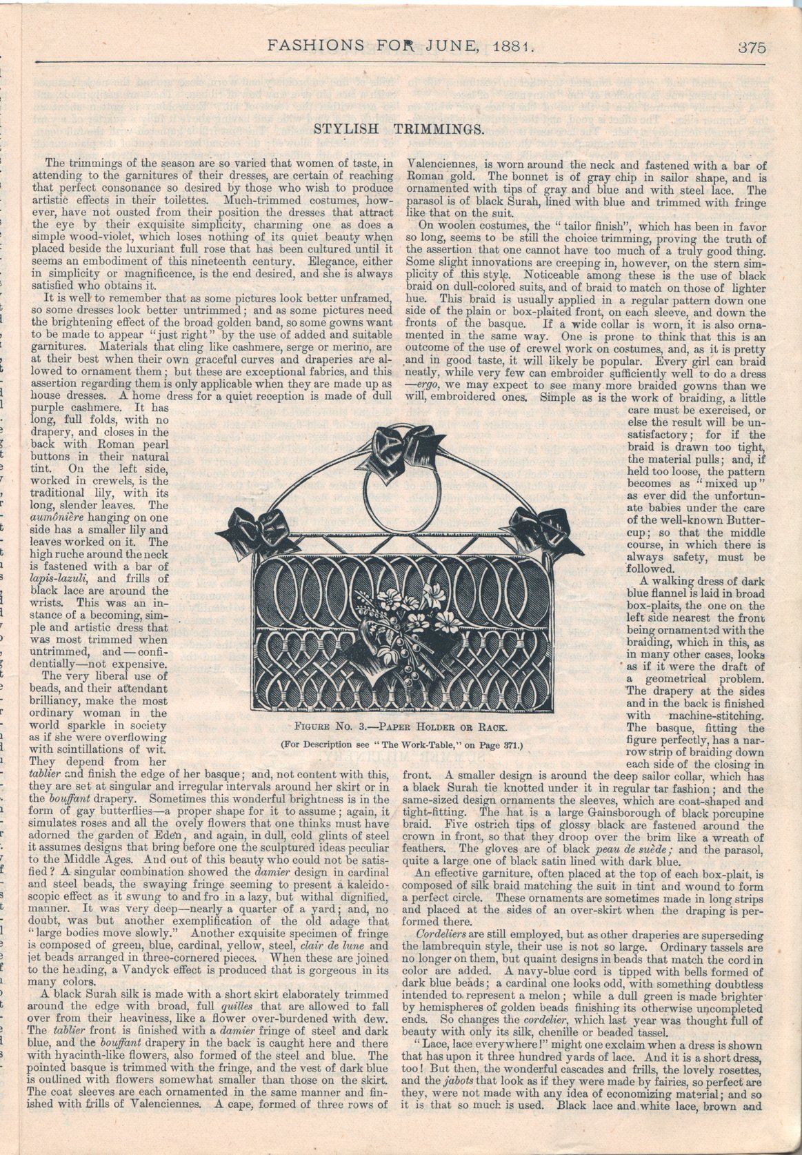 I really love the Delineator issues that I have from the 1880's and 90's. They all contain many beautiful fashion illustrations as well as information about fabrics, colors, trimmings, and even neat crafting stuff. This particular issue has a number of stunning natural form styles along with information on clothing your men and children and quite a bit about trimming and embroidery.